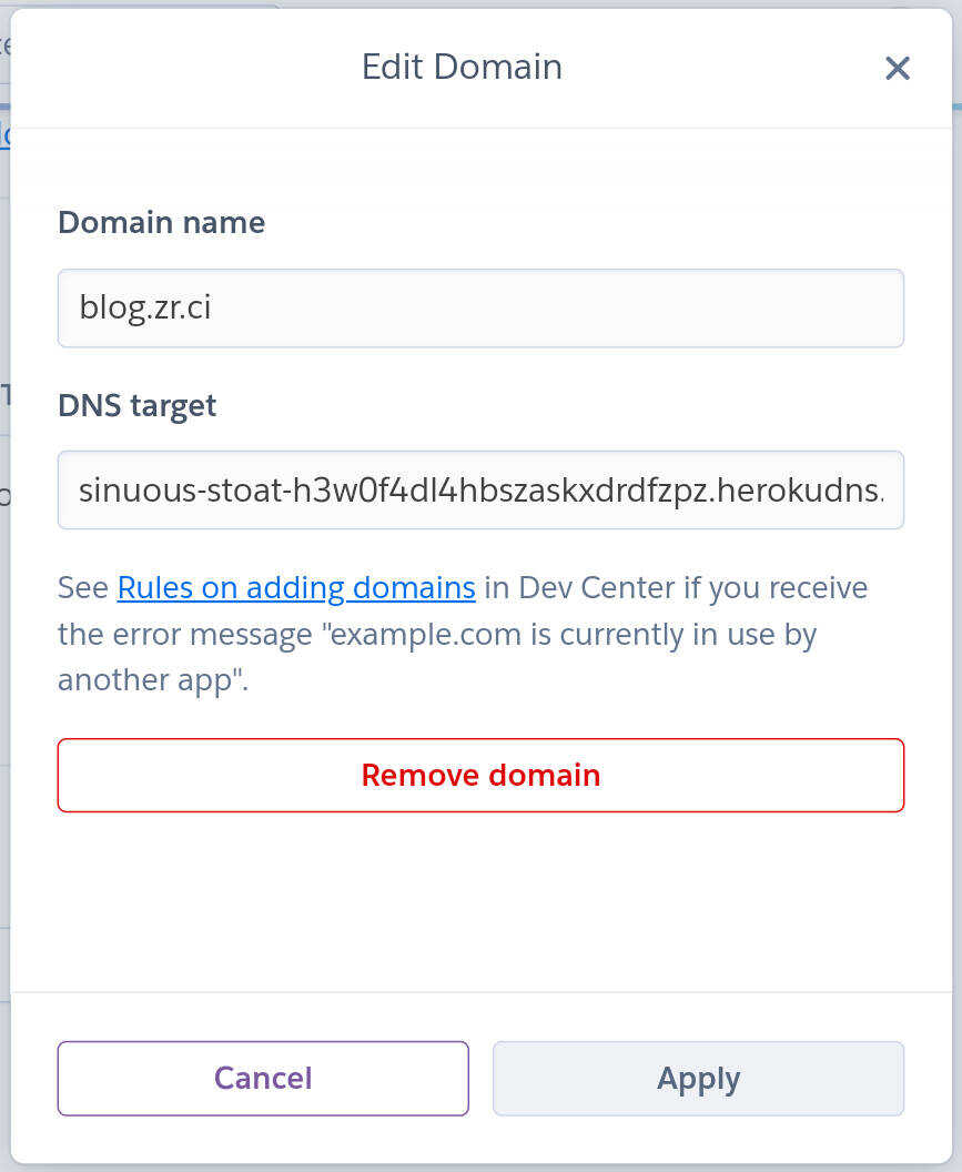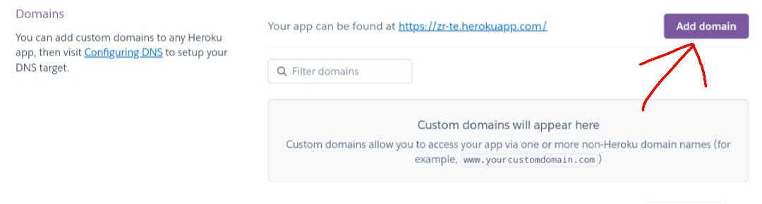 前往Heroku管理面板,找到新建的应用,点击导航栏中的 Settings,下拉找到 Domains