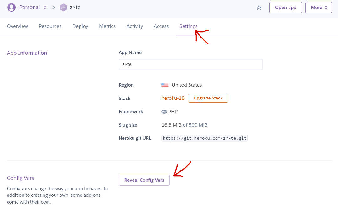 添加完 MySQL/PgSQ L后,前往Heroku管理面板,找到刚才新建的应用,点击导航栏中的 Settings,找到 Config Vars 项,点击 Reveal Config Vars
